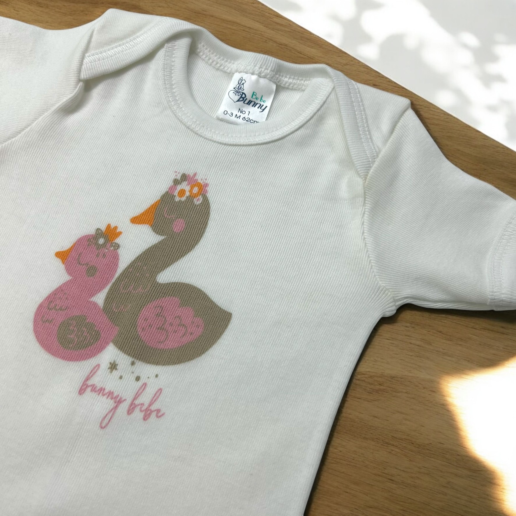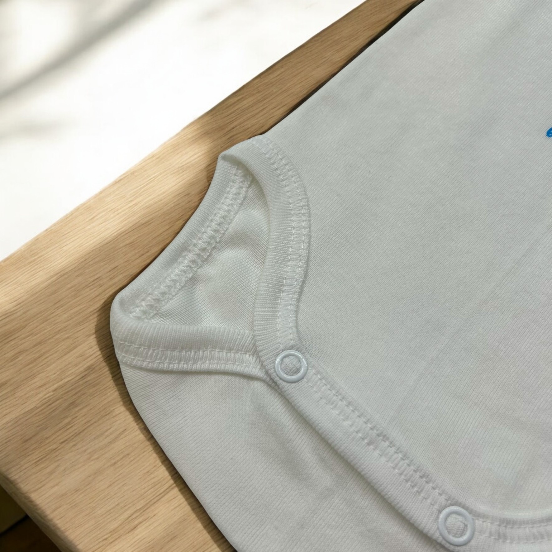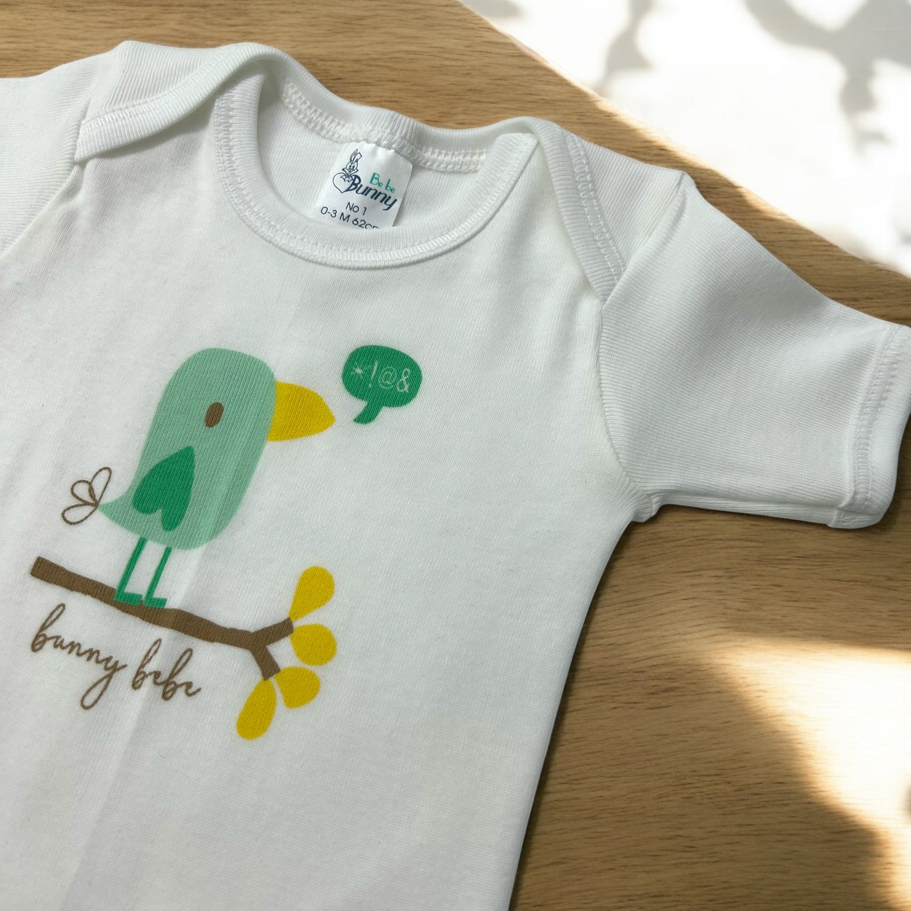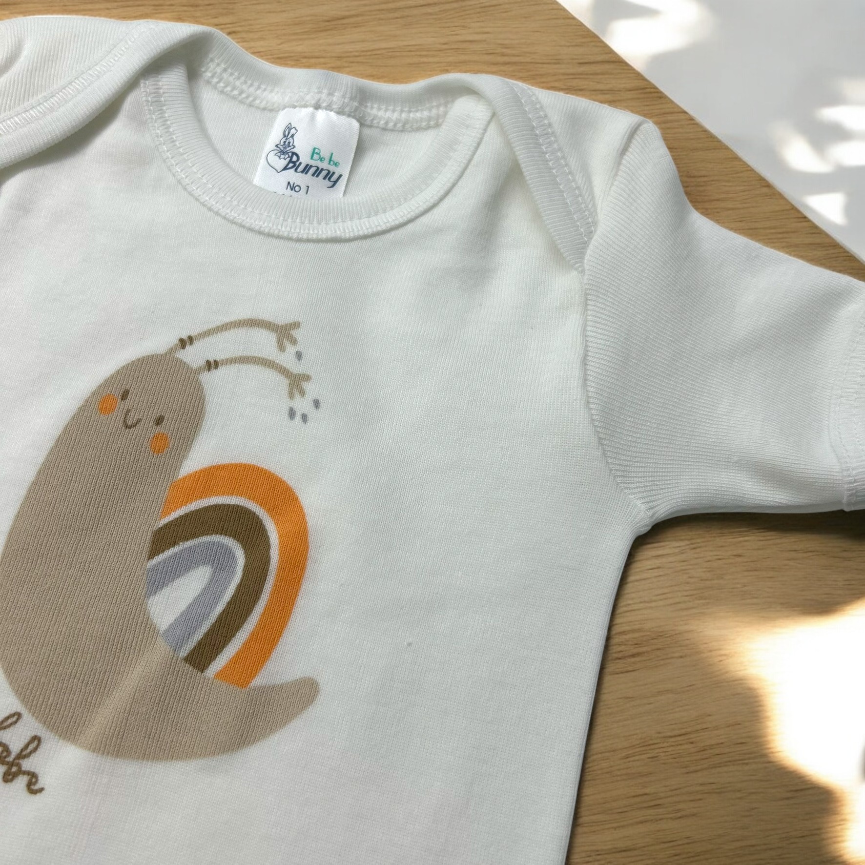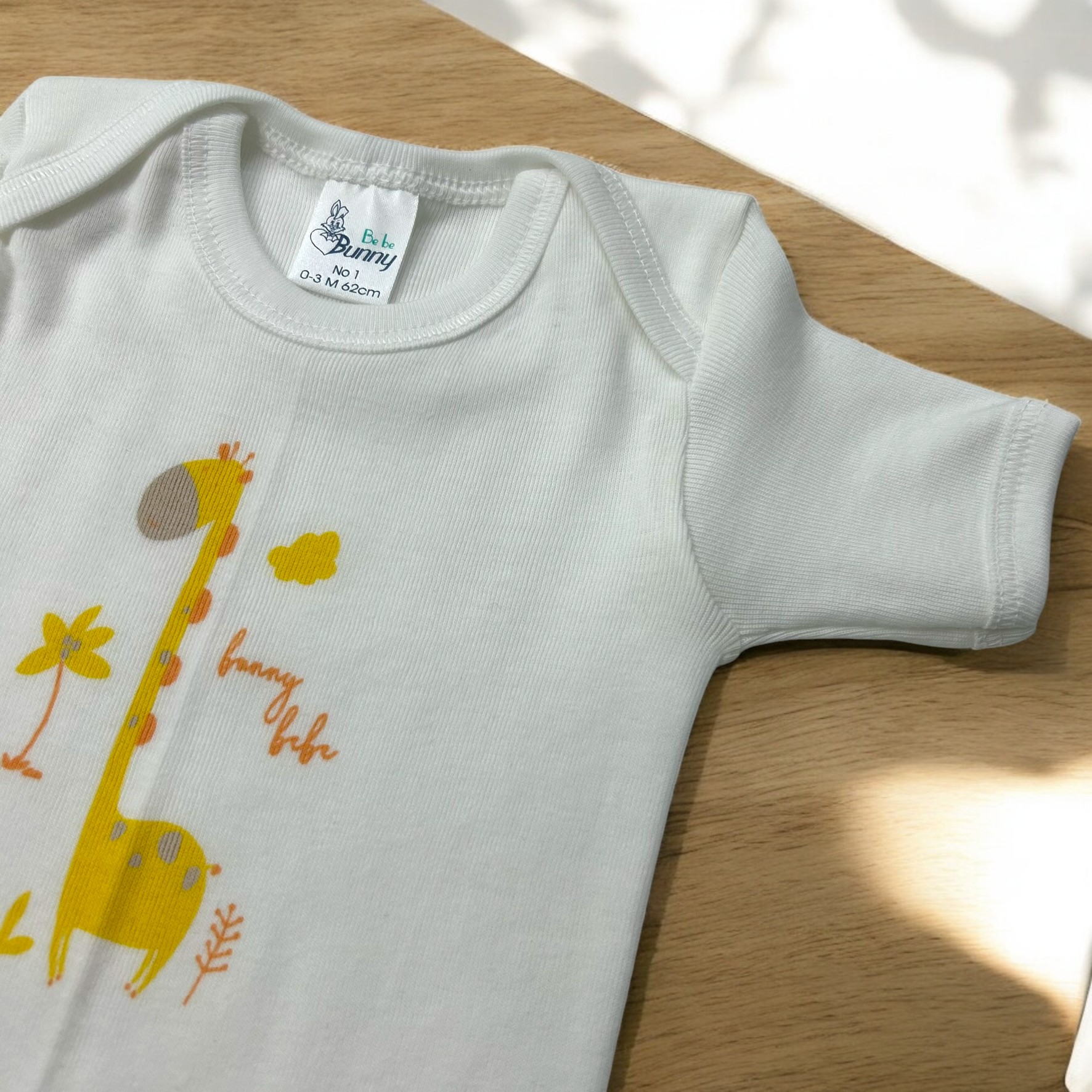 Ολόσωμα βρεφικά κορμάκια με κοντό μανίκι και τύπωμα, χωρίς πλαϊνές ραφές από 100% βαμβάκι, σε συσκευασία 6 τεμαχίων.